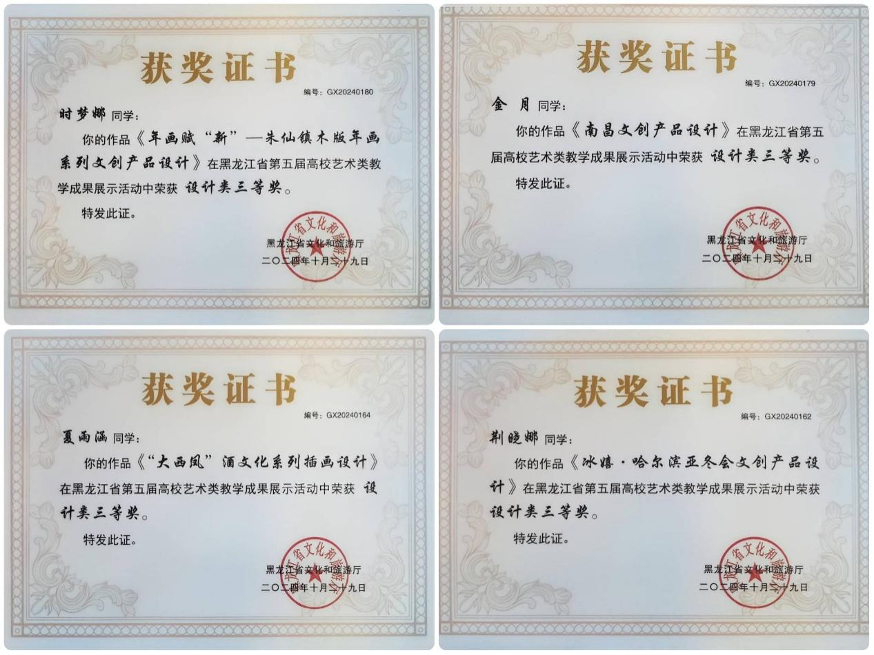 近日,由黑龙江省文化和旅游厅主办的黑龙江省第五届高校艺术类教学成果展示活动落下帷幕,我校信息工程系视觉传达设计专业金月、时梦娜、夏雨涵、荆晓娜四位同学荣获设计类三等奖。此次黑龙江省高校艺术类教学成果展示活动共有2114件作品投稿,最终获奖833件。接到活动通知后,信息工程系视觉传达设计专业负责人姜岩、专业教师王慧茹、齐媛园、王昀碧积极组织专业学生参与。备赛中,学生们开拓思维、大胆设计,指导教师给予建议...