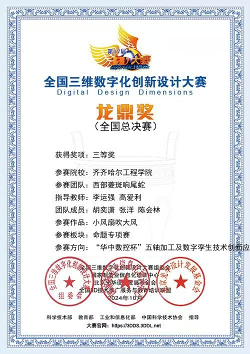 近日,第 17 届全国三维数字化创新设计大赛全国总决赛传来喜讯,在“华中数控杯”五轴加工及数字孪生技术创新应用命题专项赛上,我校机电工程系机械设计制造及其自动化专业学生胡奕潇、张洋、陈会林的参赛作品《小风扇吹大风》获得国赛三等奖。本次比赛于11月16日举行,由全国三维数字化创新设计大赛组委会、国家制造业信息化培训中心主办,大连理工大学承办。全国三维数字化创新设计大赛是在国家大力实施创新驱动发展战略、推...