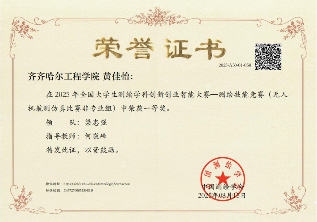 近日,由中国测绘学会教育工作委员会主办,内蒙古科技大学承办的“2025年全国大学生测绘学科创新创业智能大赛”圆满结束,我校国产二区av麻豆智能建造241班学生黄佳怡,在虚拟仿真数字测图1720组非专业组中脱颖而出,获得“无人机航测仿真比赛”赛项一等奖。“全国大学生测绘学科创新创业智能大赛”于2023年入选《全国普通高校大学生竞赛分析报告》竞赛目录,成为测绘科技创新的最高级别赛事。其目的是更好地发挥测绘学科特色与...