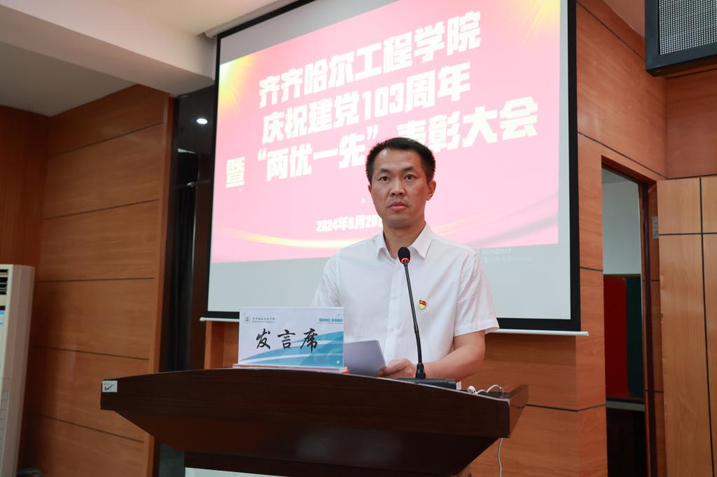 院长、党委副书记曹然彬主持会议。曹然彬在讲话中强调,各级党组织要及时传达落实会议精神,认真学习和领会讲话精神,学习先进集体和优秀个人的先进事迹,进一步把思想统一到学校发展战略上来,切实推动学校各项工作扎实开展;要以庆祝中国共产党建党103周年、党纪学习教育为契机,通过多种形式,掀起学先进、比贡献的热潮,激励广大党员干部进一步抢抓机遇、迎难而上,为学校华丽通过本科教育教学审核评估而奋力拼搏,为推动学校高质量发展作出新的、更大的贡献。