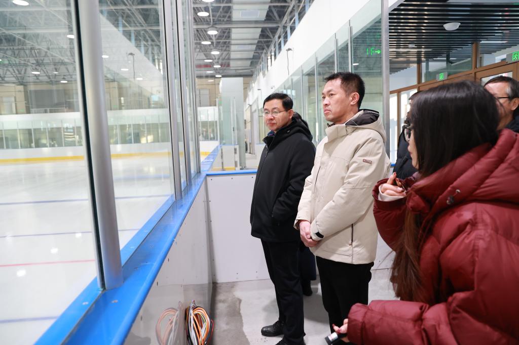 座谈会前,李维杰一行实地调研考察了我校北区校园冰上运动馆、人民会堂以及大健康教育实训教学中心等地。