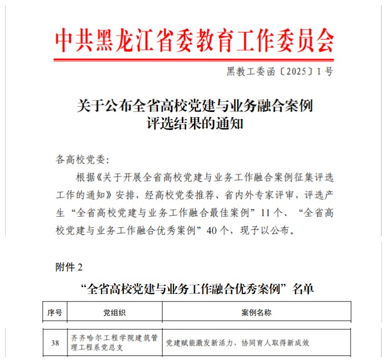 1月13日,黑龙江省委教育工委组织的全省高校党建与业务融合案例评选结果公布,我校建筑管理工程系党总支的《党建赋能激发新活力,协同育人取得新成效》案例脱颖而出,获评优秀案例。