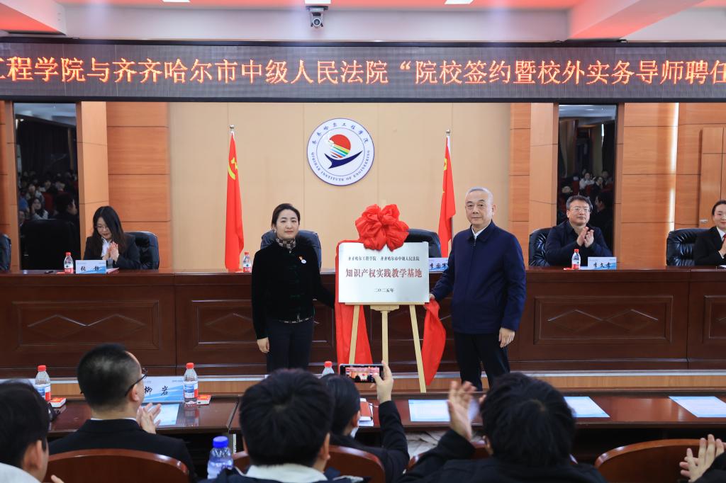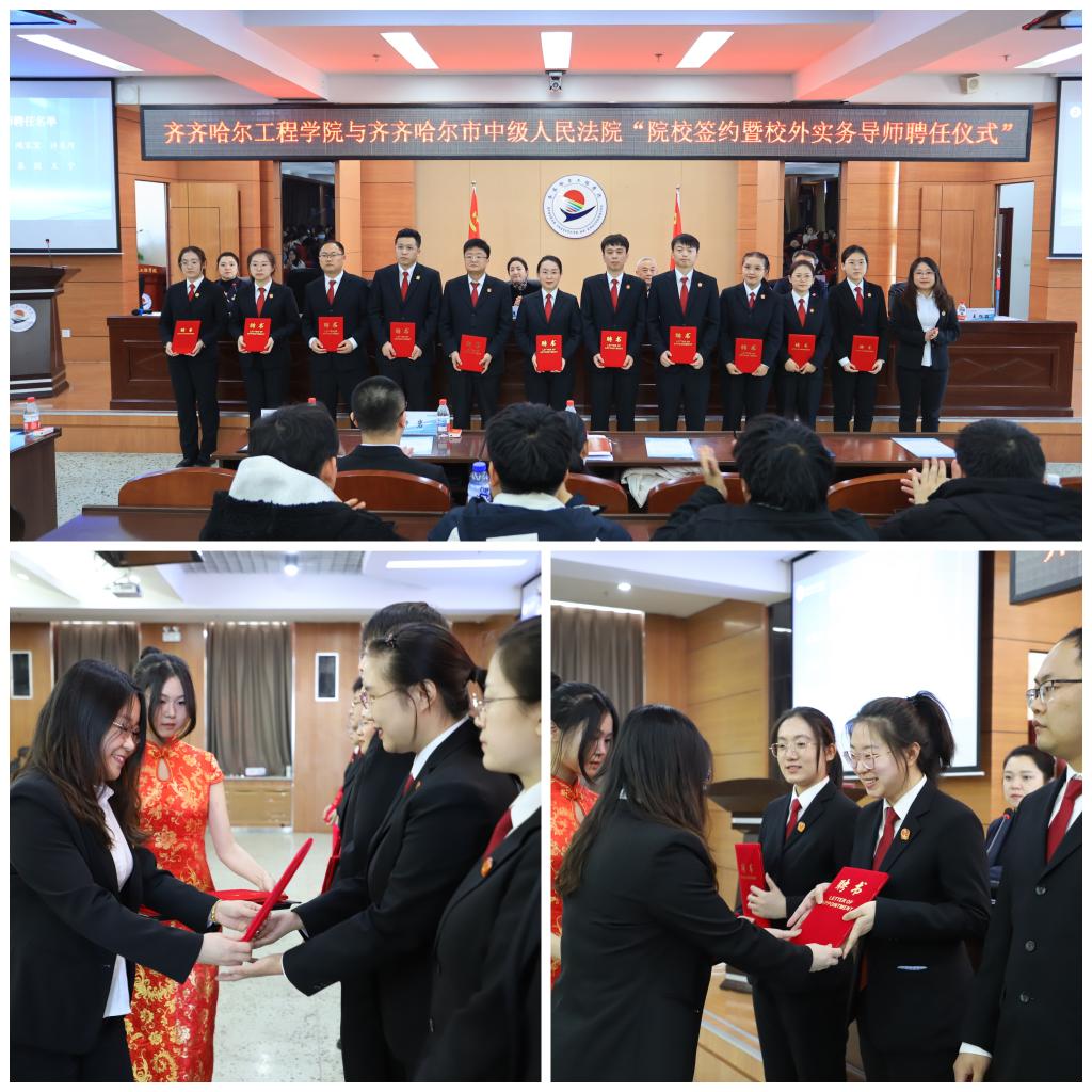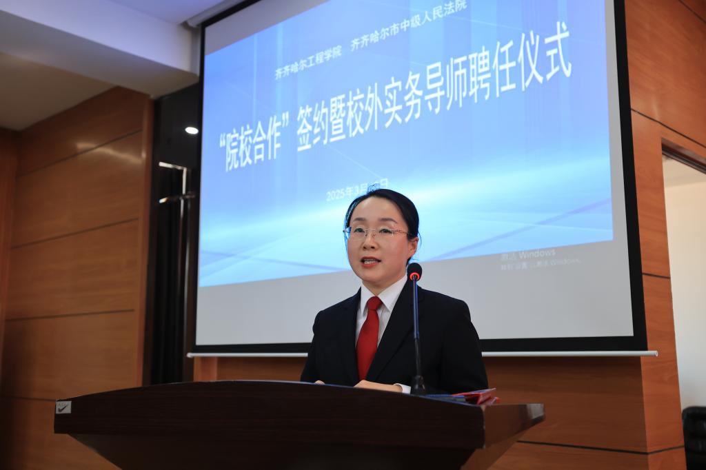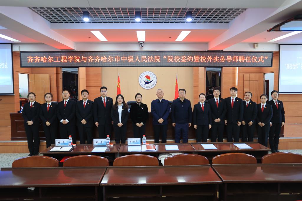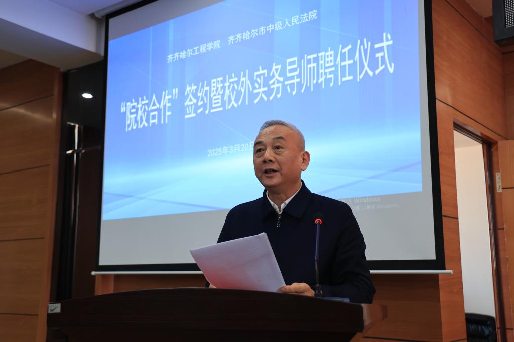 3月20日,学校与齐齐哈尔市中级人民法院“院校合作”签约暨校外实务导师聘任仪式在图书馆601报告厅举行。市法院党组副书记、副院长李国军,市法院党组成员、政治部主任李文孝,学校党委副书记、副院长陈景鑫,副院长张静出席签约仪式,相关部门负责人及人员参加。