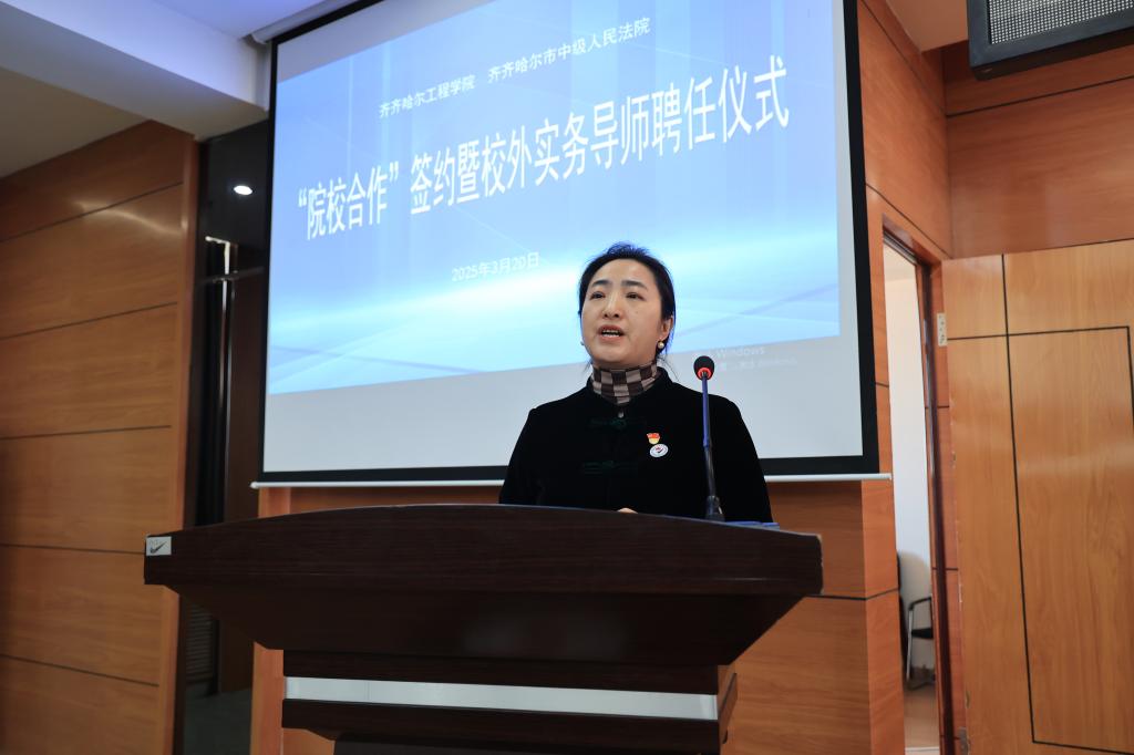 陈景鑫首先向一直以来关心支持学校发展的市法院各位领导表示感谢。简要介绍了学校在人才培养、办学模式、产业学院等方面取得的成果。她指出,聘任校外实务导师是深化产教融合、创新人才培养模式的重要举措。此次校外实务导师聘任仪式是学校与市法院深度合作的重要成果,不仅标志着学校在提升人才培养水平方面迈出了坚实的一步,也彰显了学校持续加强院校合作交流的信心和决心。希望校外实务导师能够充分发挥专业优势和实践经验,为学生的成长成才提供宝贵的指导和帮助。