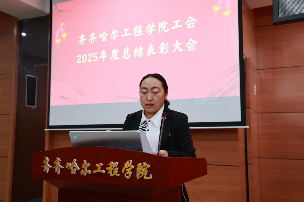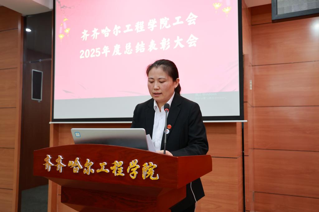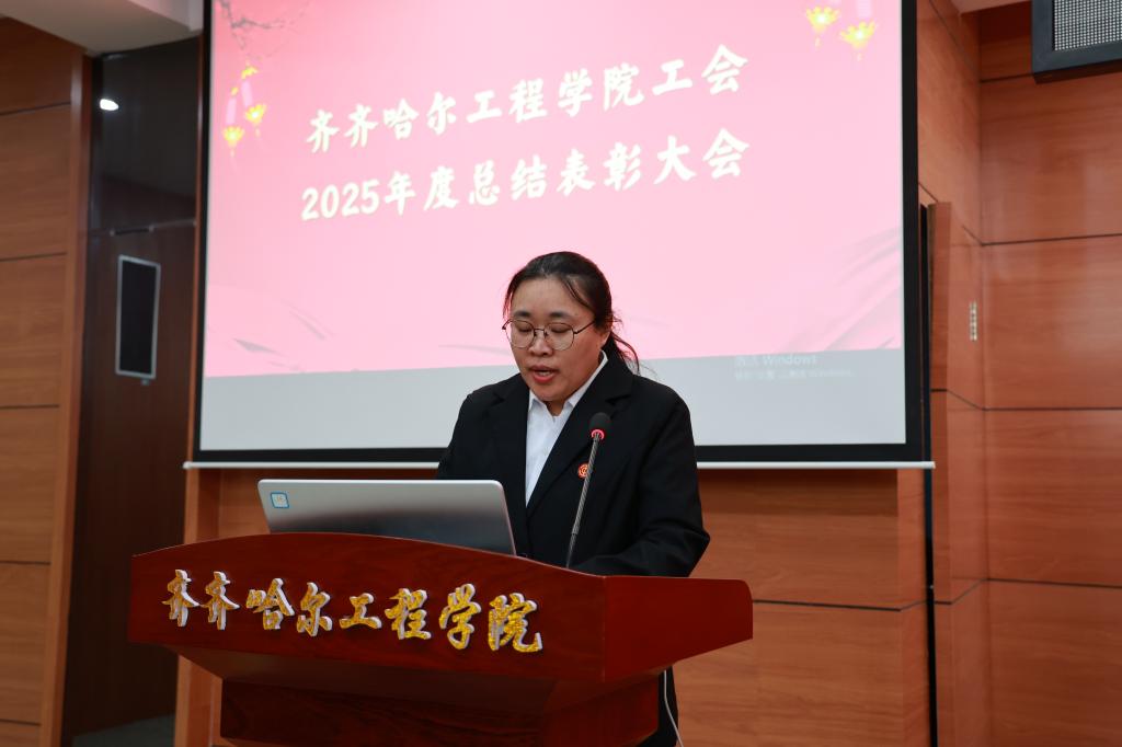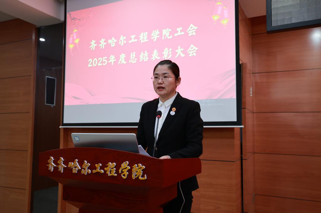 学校工会副主席、学生工作处处长王丽萍宣读《关于表彰2025年度先进基层工会和优秀个人的决定》。医学院基层工会获评“先进基层工会”,曹慧等6名同志被评为“优秀工会工作者”,宫玉斌等26名同志被评为“爱岗敬业、爱校如家”标兵,曹薇获“特别贡献奖”。