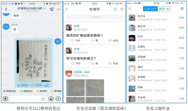 2、课中与学生“共舞”。采用钉钉直播屏幕共享的方式进行直播教学,其中穿插着观看慕课视频,教师利用钉钉白板做知识框架的总结,课堂连麦,互动面板答题,投票等教学环节,带领学生跟着教师的节奏,从而实现教学目标。同时在授课过程中不忘培养学生对专业的深入认知,通过我校护理学专业的毕业生现在各地一线对抗疫情的故事,让学生明白医学生的责任感和使命感。课程思政实例:如护理学 2017 届毕业生高鑫支援武汉抗击疫情一线。