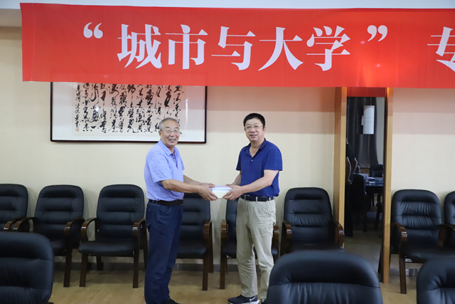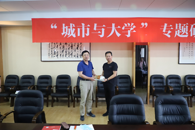 在图书馆603会议室,理事长曹勇安、副院长张振笋、校党委原副书记许长艳、宣传部副部长郭伟伟等校方代表,与来宾一起畅谈“城市与大学”的话题。