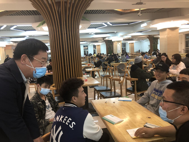 晚上7点半左右,理事长首先来到三味餐厅,从一楼的每一处档口走起,先是询问菜价,然后仔细地检查饭菜的温度和质量,并询问商家有没有免费的热粥或者热汤提供给刚刚下晚课的学生。遇见正在排队或者就餐的同学,他就笑着聊上几句:“同学啊,这一碗米线多少钱啊?够不够吃啊?今年校园准封闭期间食堂饭菜质量怎么样啊?”面对如此慈祥的长者,学生们都放下了拘谨,纷纷热情地和理事长交谈起来。