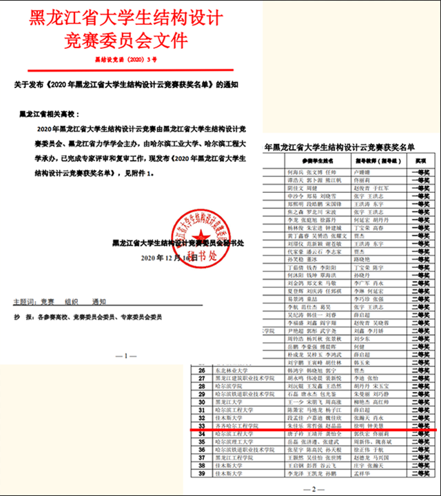 12月16日,建筑工程系土木工程专业学生和机电工程系学生组成的7支代表队,在2020年黑龙江省大学生结构设计云竞赛中,获得“二等奖”二项,“三等奖”三项。