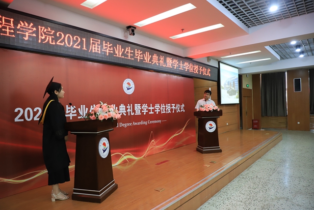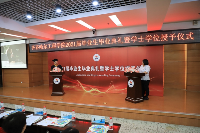 院长曹然彬宣读了《关于表彰2021年“优秀毕业生”的决定》,机电工程系车辆工程专业李友朵等71名学生被授予2021年“优秀毕业生”荣誉称号。工会主席、总会计师姜岩与副院长白雪为“优秀毕业生”颁发荣誉证书。