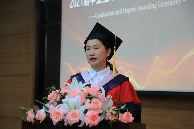 又一年,丁香花开;又一年,桃李芬芳。7月3日上午,学校2021届毕业生毕业典礼暨学位授予仪式在图书馆601报告厅隆重举行,共同庆祝1258名本科学生、196名专科学生顺利毕业。学校领导、学位评定委员会全体成员、各系(部)领导、教师代表、校友代表、毕业班辅导员及2021届毕业生和家长代表参加了典礼。本次典礼采用线下和线上抖音直播相结合的方式举行,近万名家长、校友、师生在线参会。伴随着学生们带来的歌曲闪唱《春暖花开》,毕业典礼拉开了序幕。