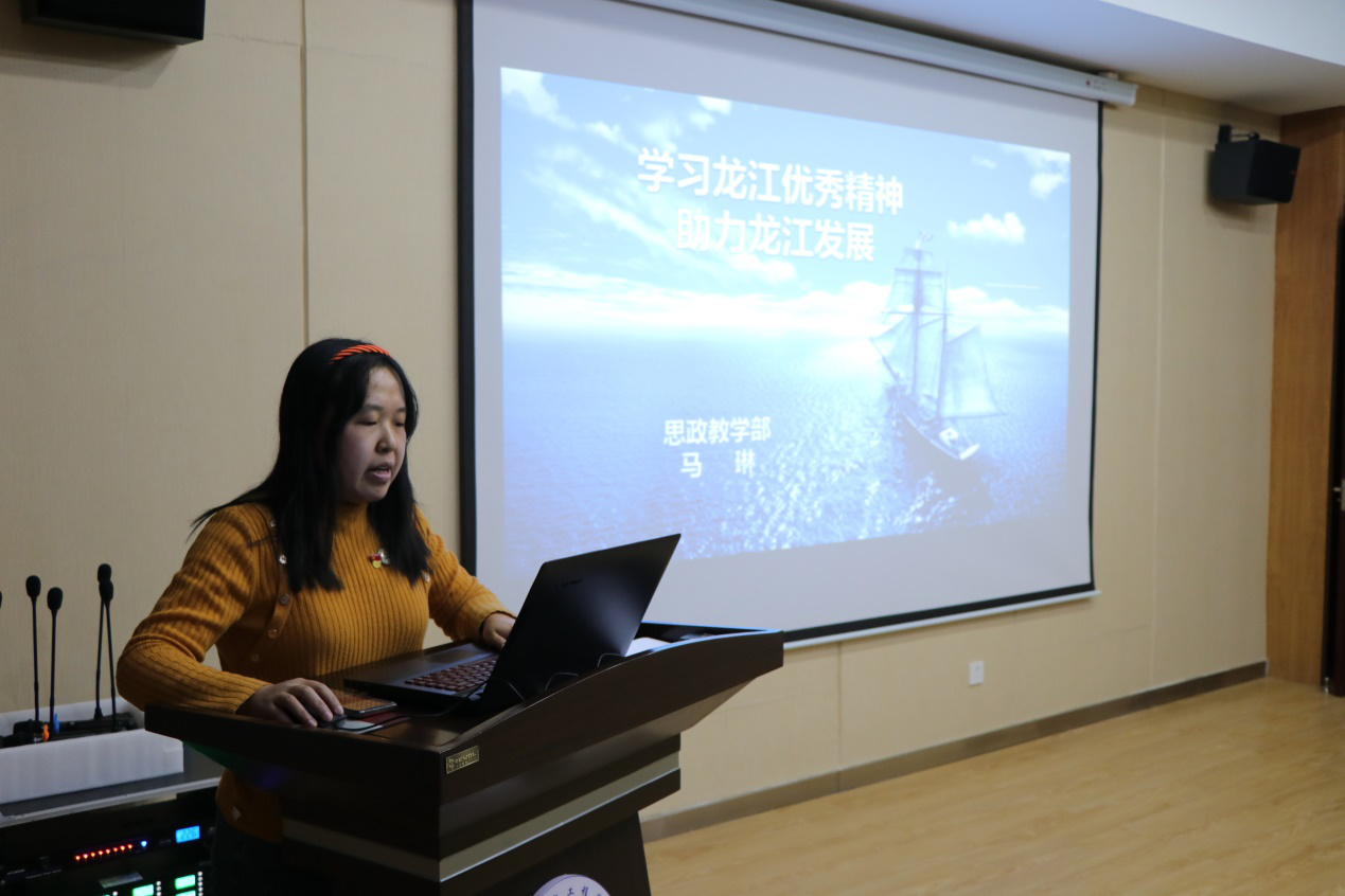 思政教学部马琳老师以《学习龙江优秀精神 助力龙江发展》为题进行党史学习教育专题讲座。从龙江精神内涵、国家关于振兴东北的主要政策、黑龙江振兴发展的新特征和大学生对龙江振兴的意义四个方面进行讲述,重点指出我校学生关于创业的认识与做法,彰显了龙江大学生的时代风貌。随后传达了上级文件精神,开展了思想政治工作等三个专题学习。