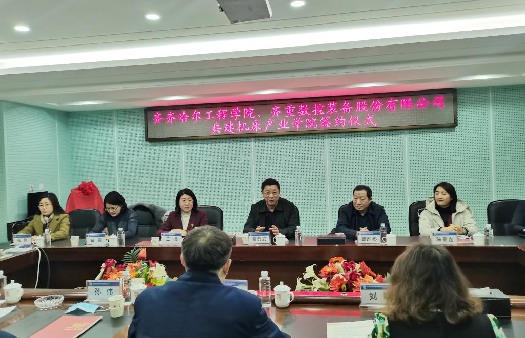 12月13日下午,我校与齐重数控装备股份有限公司共建“机床产业学院”签约揭牌仪式在齐重数控装备股份有限公司举行。齐齐哈尔市龙沙区委常委、组织部部长王扬,齐重数控装备股份有限公司党委书记、董事长王俊峰,总经理孙伟,我校理事长曹勇安、院长曹然彬、副院长白雪、教务处处长张静、创业学院院长陈景鑫及相关部门负责人参加签约仪式。