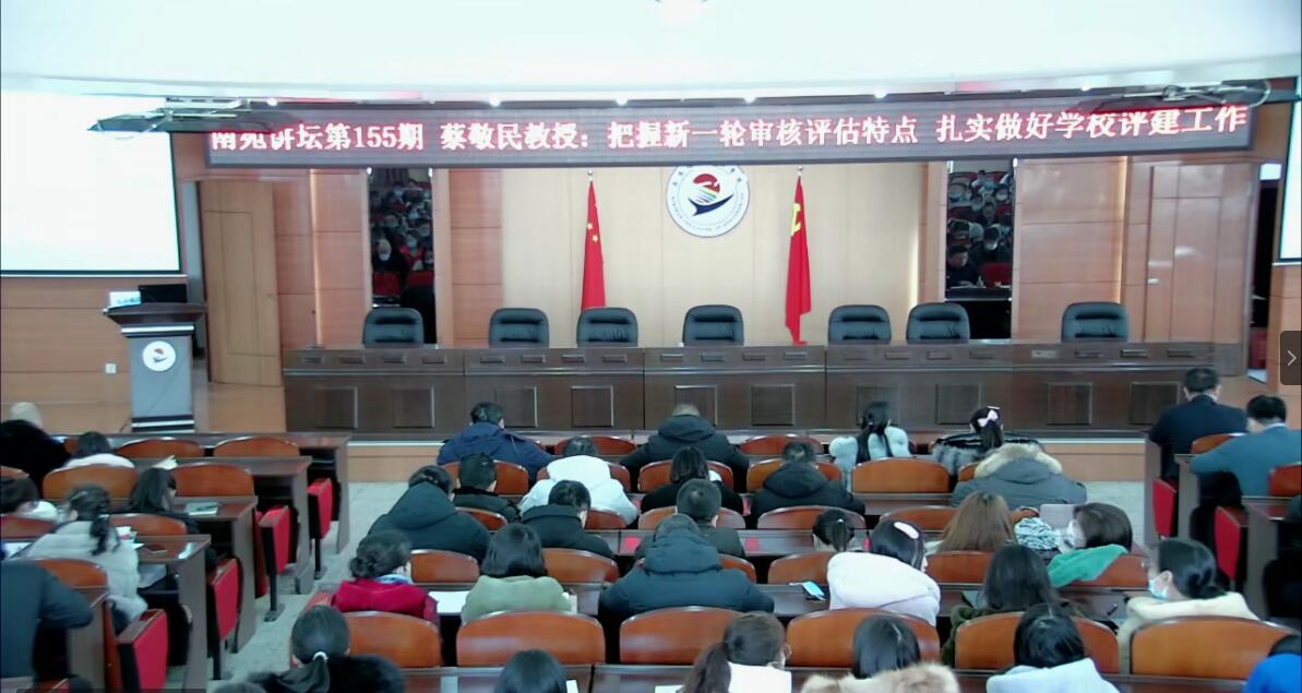 蔡敬民书记从新一轮审核评估六个突出特点、新一轮审核评估试点工作介绍、新一轮审核评估的申请与自评、新一轮审核评估的入校与整改四个方面开展讲座。