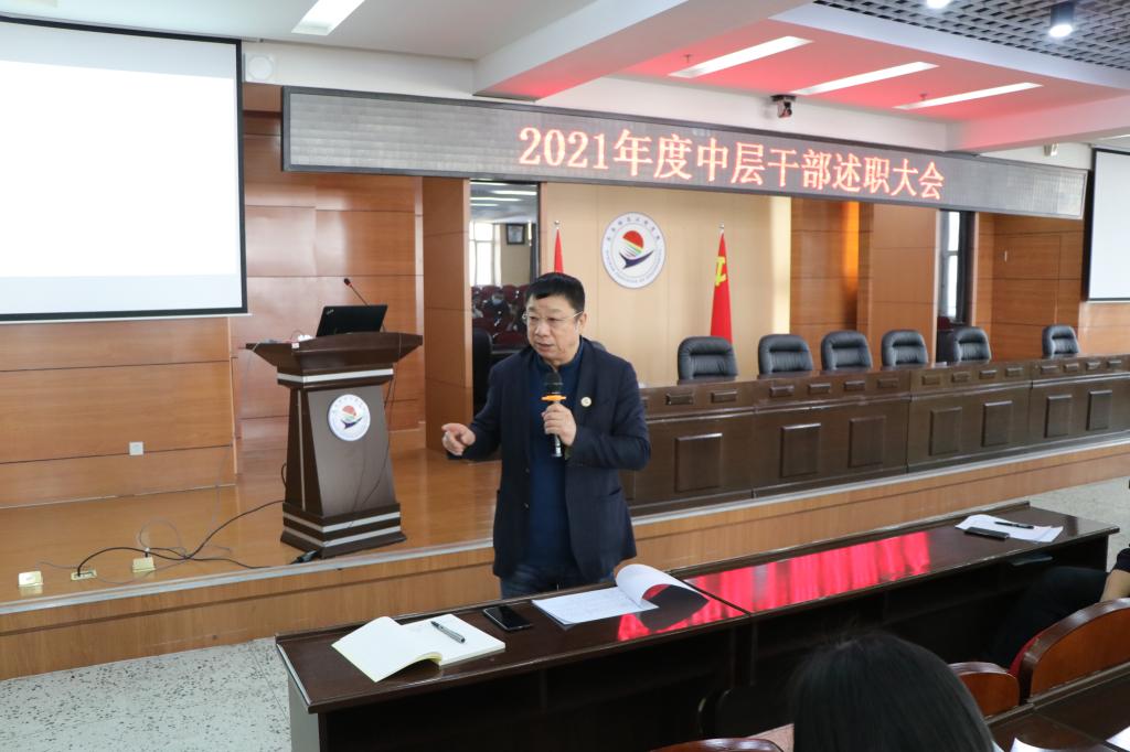 1月21日9点,学校在图书馆601报告厅组织召开2021年度中层干部述职大会,45名中层干部进行述职,校领导、各部门正、副职及内设科室负责人参会。人事处副处长张平主持本次会议。
