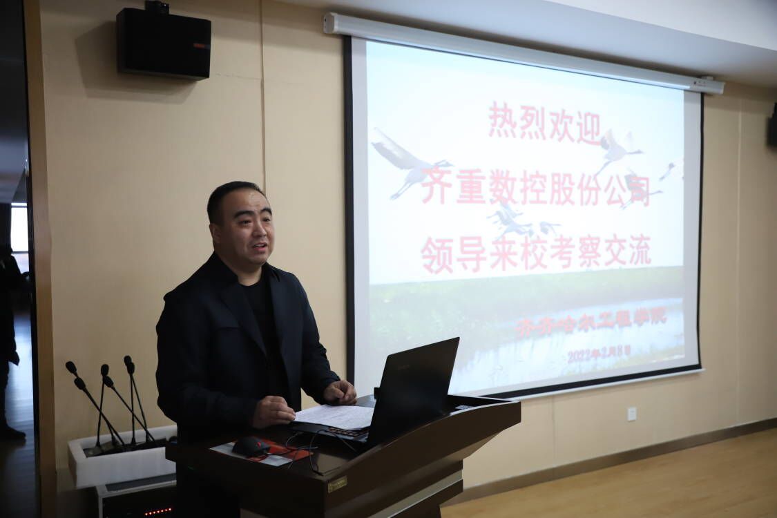 在图书馆603南会议室,机电工程系主任郭磊回顾了学校与齐重数控的深厚历史渊源,介绍了学校的发展历程,在课程建设、人才培养方面的优势与发展成果。表示,通过校企的深度合作,学生实现从学校到岗位的“零距离”对接,对全面了解企业生产岗位、提升一线实践能力以及培养职业素质等方面具有积极的意义,同时解决产淡旺季与用人之间的矛盾,实现了双赢。