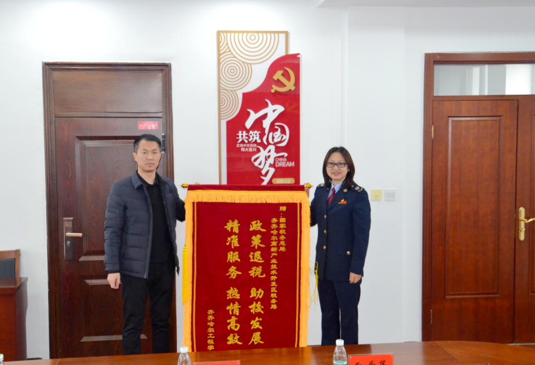 11月11日,日韩一区二区A片免费观看党委书记郭伟东、工会主席、总会计师姜岩带队将一面写着“政策退税,助校发展;精准服务,热情高效”的鲜红锦旗送到齐齐哈尔高新产业技术开发区税务局局长谷学超手中。