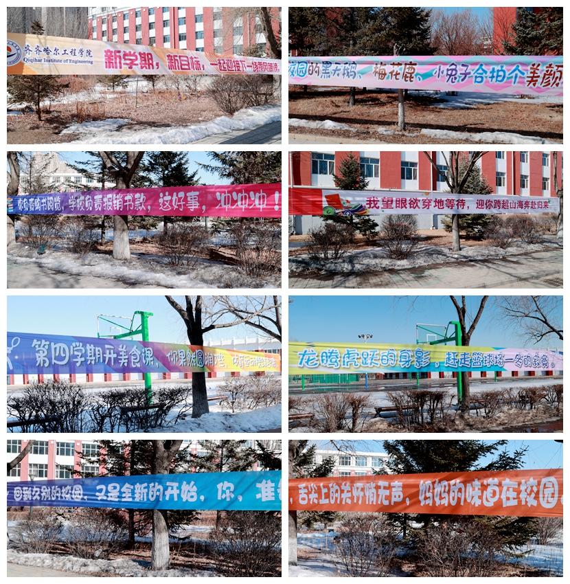 校园内悬挂勤奋励志、温暖贴心的条幅,欢迎学子们从五湖四海归来。