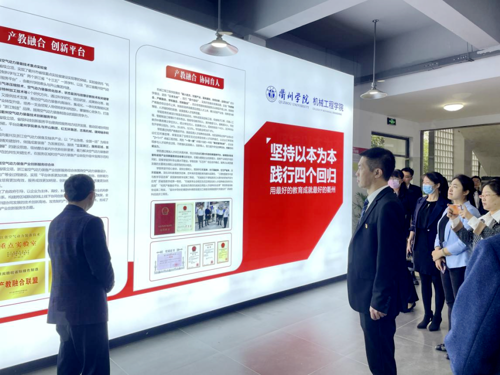 11日上午,考察团一行来到衢州学院。先后参观考察该校产教融合中心、机械工程学院(浙江省空气动力装备技术重点实验室)、南孔文化展示厅、化材学院(氟硅新材料绿色制造浙江省工程研究中心)及一号教学楼。