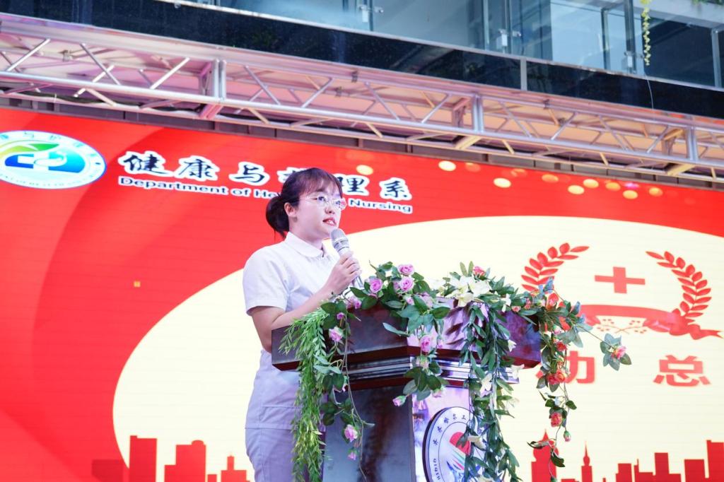 助产学211班唐晓蕊作为学生代表发言,她表示,大赛鼓舞她进步,助推她成长,收获很多。