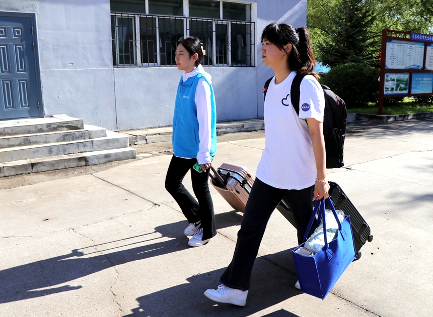 穿蓝马甲的健康与护理系学姐迎上去接过一个拉杆箱。