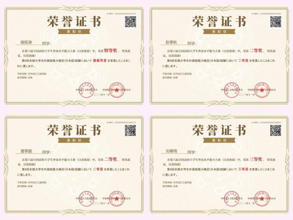 近日,第六届全国高校大学生外语水平能力大赛成绩揭晓,管理工程系英语专业的骆权涛同学在日语赛道获得特等奖;彭季秋和唐章磊同学获得二等奖;刘春雨等八名学生以及信息工程系计科231班黄岚、计科232班秦川东、计科233班肖婷获得三等奖;我校荣获“最佳院校组织奖”;朱琳老师荣获“优秀指导教师称号”。
