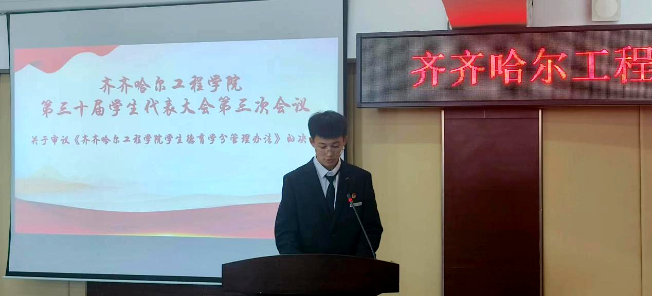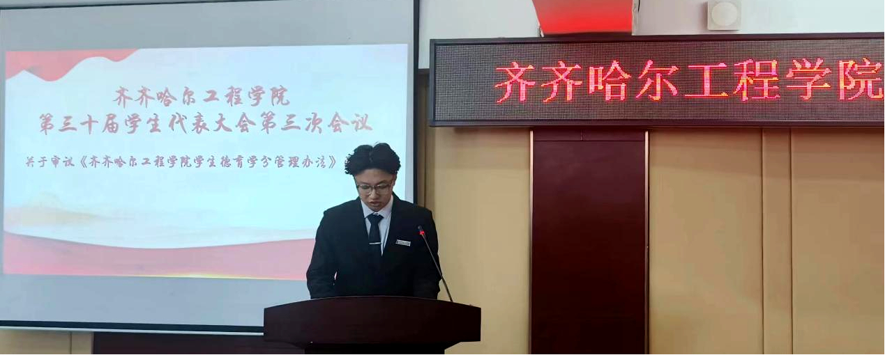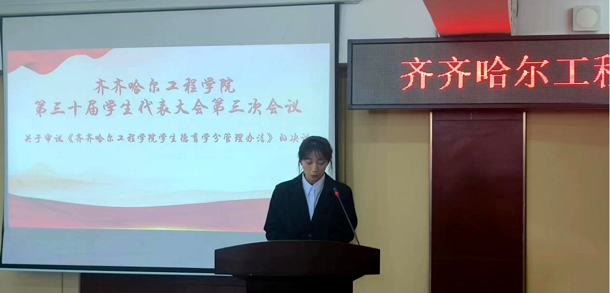 11月21日,学校第三十届学生代表大会第三次会议在图书馆501报告厅举行。团委副书记王雪、机电工程系学生会指导教师张勇、建筑工程系学生会指导教师刘子豪、管理工程系学生会指导教师刘天缘、信息工程系学生会指导教师刘铭炜、健康与护理系学生会指导教师岳国鑫及160名学生代表参加大会。会议议题为修订《日韩一区二区A片免费观看德育学分管理办法》。