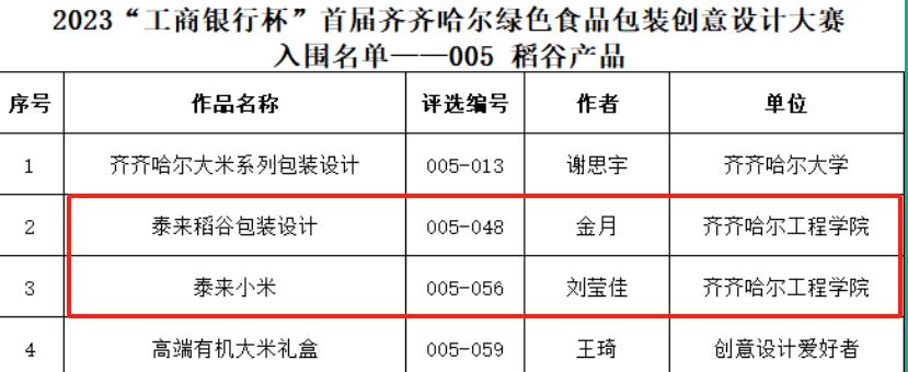 近日,由中共齐齐哈尔市委宣传部、齐齐哈尔市农业农村局主办的“工商银行杯”首届齐齐哈尔绿色食品包装创意设计大赛,公布初赛入围名单,学校校信息工程系视觉201刘莹佳、视觉203金月、视觉211黄诗淼三位同学以出色的设计风格被评审认可,初选入围。