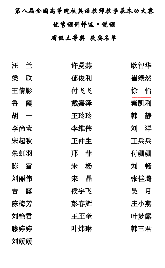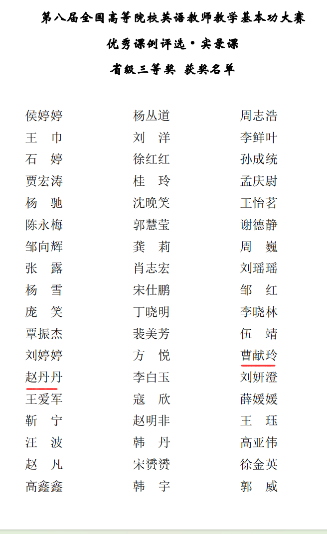 在外研社“教学之星”大赛上,基础部大学外语教研室教师孙德梅、刘双丽、刘欢、李爽、赵峥光荣获三等奖;在第八届全国高等院校英语教师教学基本功大赛上,基础部大学外语教研室教师赵丹丹和曹献玲均荣获优秀课例评比•实录课省级三等奖,徐怡荣获优秀课例评比•说课省级三等奖,孙德梅和孙婷婷、宫寄程和鹿惠敏的两个教师团队均荣获优秀课例评比•微课全国优胜奖。