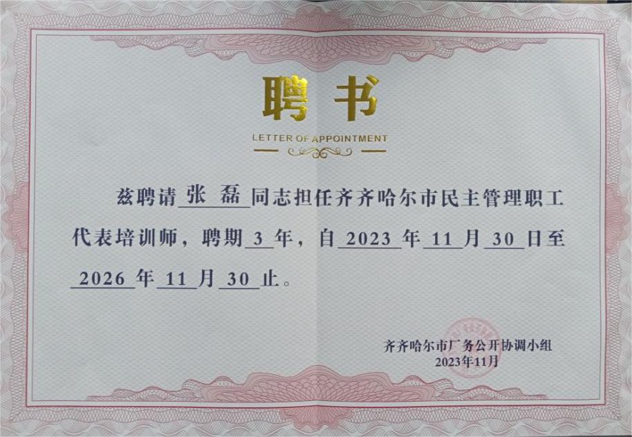 我校民主管理工作已纳入《齐齐哈尔市厂务公开民主管理典型经验材料范例》交流手册,同时,张磊被市总工会授予“民主管理职工代表培训师”荣誉称号。