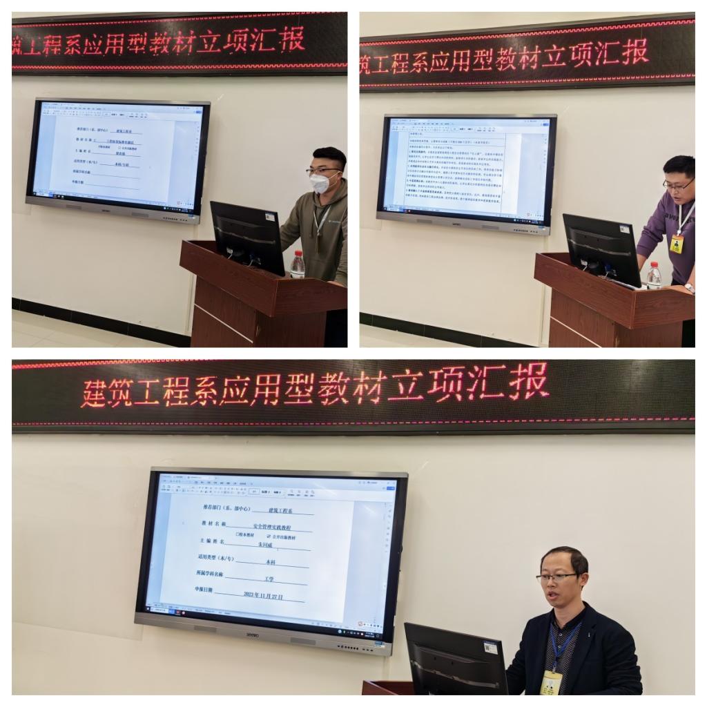 为深入推进教学改革,提高人才培养质量,满足创新型、应用型人才培养目标的需要,鼓励教学和科研成果突出、与企业合作基础良好的教学团队编写教材,促进学校教材建设以及重点课程的建设,近日,建筑系在2号教学区2409会议室召开校级重点建设课程及校级应用型教材立项汇报会,会议由教学副主任郝丽娜主持,建筑系党总支书记、副主任徐明,党总支副书记刘贤鹏以及建筑系全体教工参会。
