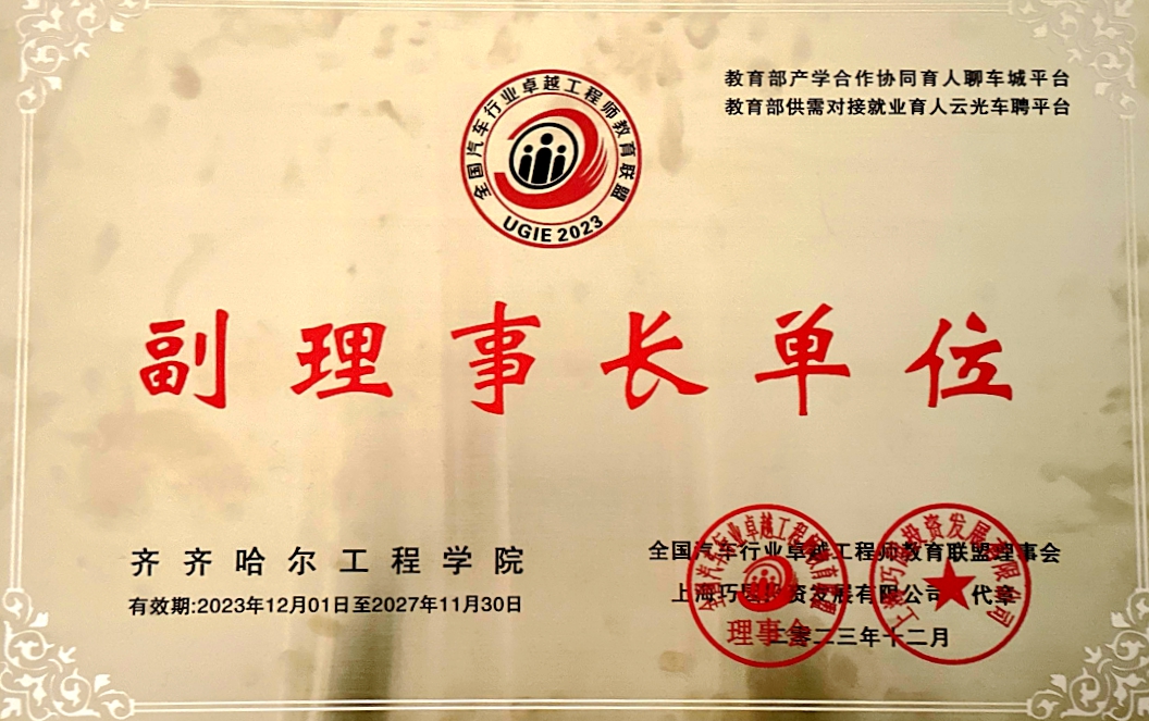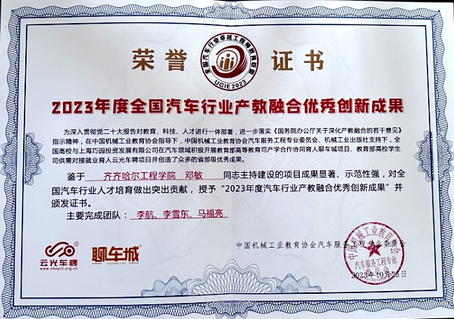 在2023年全国汽车行业产教融合优秀创新成果表彰大会上,宋学敏秘书长、巧园投资发展集团李兴总裁为桂林航天工业学院汽车与交通工程学院张治龙主任、日韩一区二区A片免费观看邓敏副教授等20所高校的教育部巧园汽车项目负责人颁发荣誉证书,以表彰他们为专业建设和发展、汽车卓越工程师人才培育做出的杰出贡献。