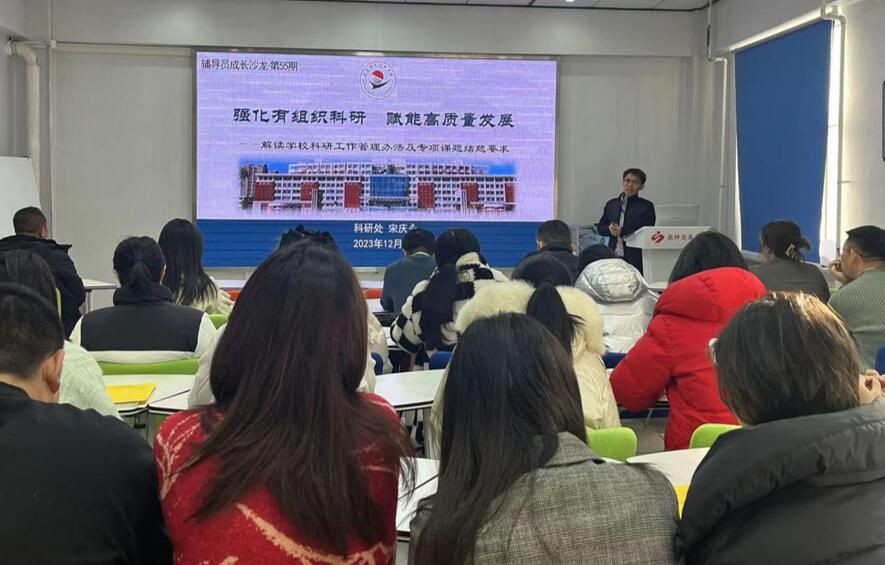 宋庆永以教育评价制度改革为切入点,强调要以学生为中心,不忘教育初心,要抓牢教育教学主阵地,强化“有组织科研”,并详细解读了学校该管理办法,强调了专项课题结题所需的材料。最后,介绍了常见科研成果类型、常见的学术不端行为,要加强科研诚信建设,不能触犯学术道德红线。