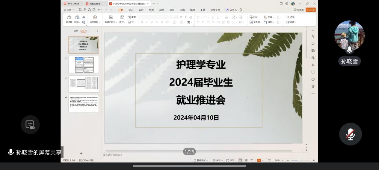 首先,孙晓雪从国家、行业、个人三个方面向学生分析了护理本科生就业趋势,指出,护理行业已成为国家布点控制专业,各级综合医院处于高质量建设过程中,学生要学会调整目标,并分析目前学生主要就业方向为医院、职业老师、考研考公三大类。最后,她说明了学生返校的具体时间和返校后的安排,要求学生在返校途中注意安全,及时与专业联系。