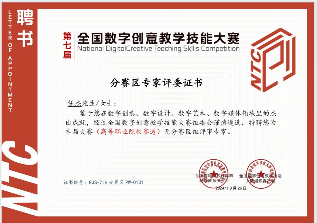 近日,全国数字创意教学技能大赛组委会在北京市正式公布了本届大赛(高等职业院校赛道)无分赛区组的评审专家名单。经过组委会的谨慎遴选和综合考虑,学校信息工程系视觉传达设计专业长姜岩、专业教师任杰被特聘为本次大赛的评审专家。