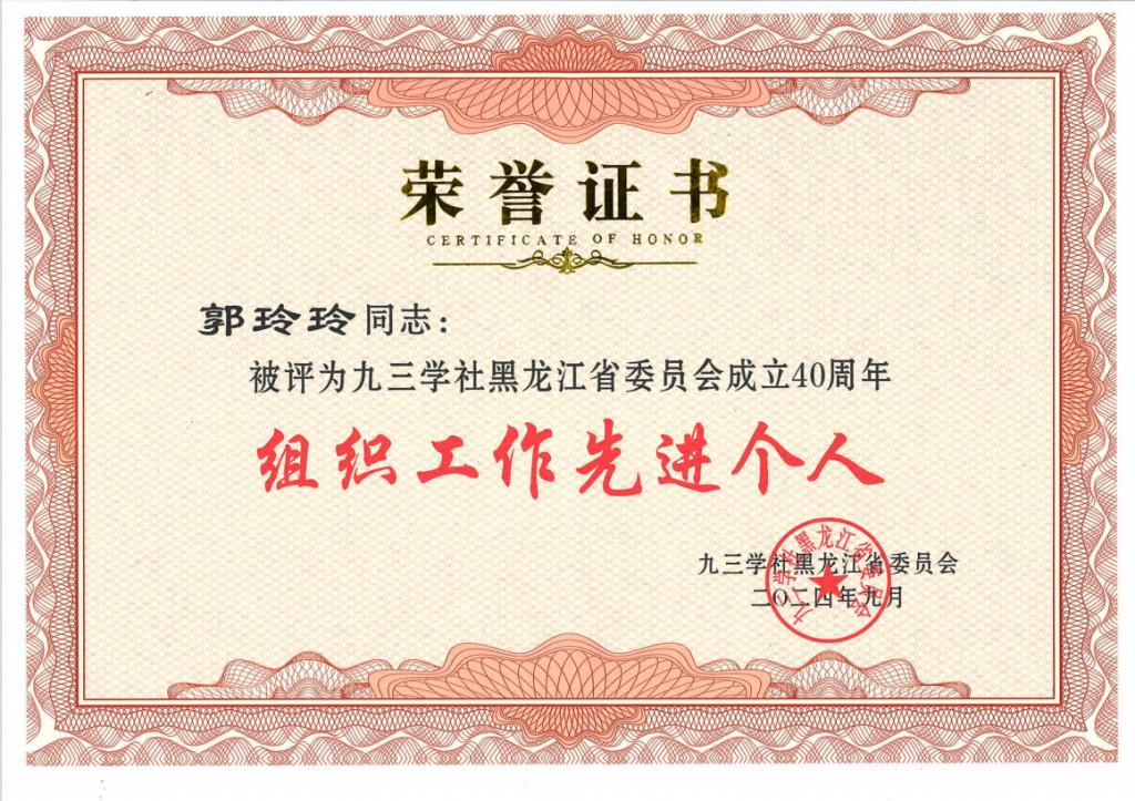 近日,为庆祝九三学社黑龙江省委员会成立40周年,激励全省各级社组织和广大社员为建设中国特色社会主义事业作出新贡献,九三学社黑龙江省委员会对2022年换届以来在组织工作、机关建设、宣传思想、社会服务、参政议政等方面表现突出的各级社组织、社员予以表彰。