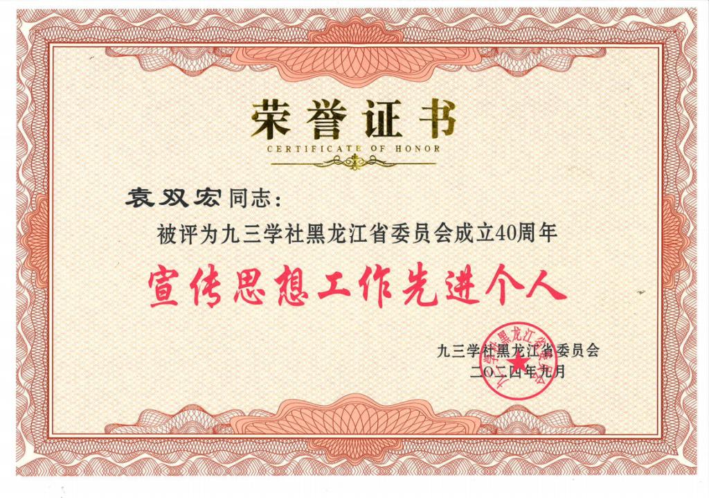 袁双宏被评为“宣传思想工作先进个人”。袁双宏在各项政治活动中,始终以身作则,发挥模范带头作用,积极宣传九三文化和精神,为社员们树立了良好的榜样;积极发展新社员,为组织注入新鲜血液、增添活力。