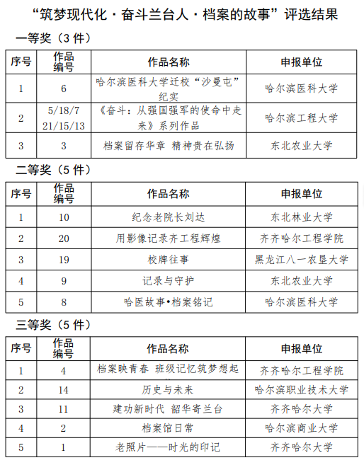 近日,黑龙江省高等院校档案学会关于开展“筑梦现代化˙奋斗兰台人˙档案的故事”短视频征集评选活动结果公布,我校党委宣传统战部教师隋亮的参评作品《用影像记录齐工程辉煌》荣获二等奖,康护工程系学生邹梓煜的参评作品《档案映青春 班级记忆筑梦想起航》荣获三等奖。