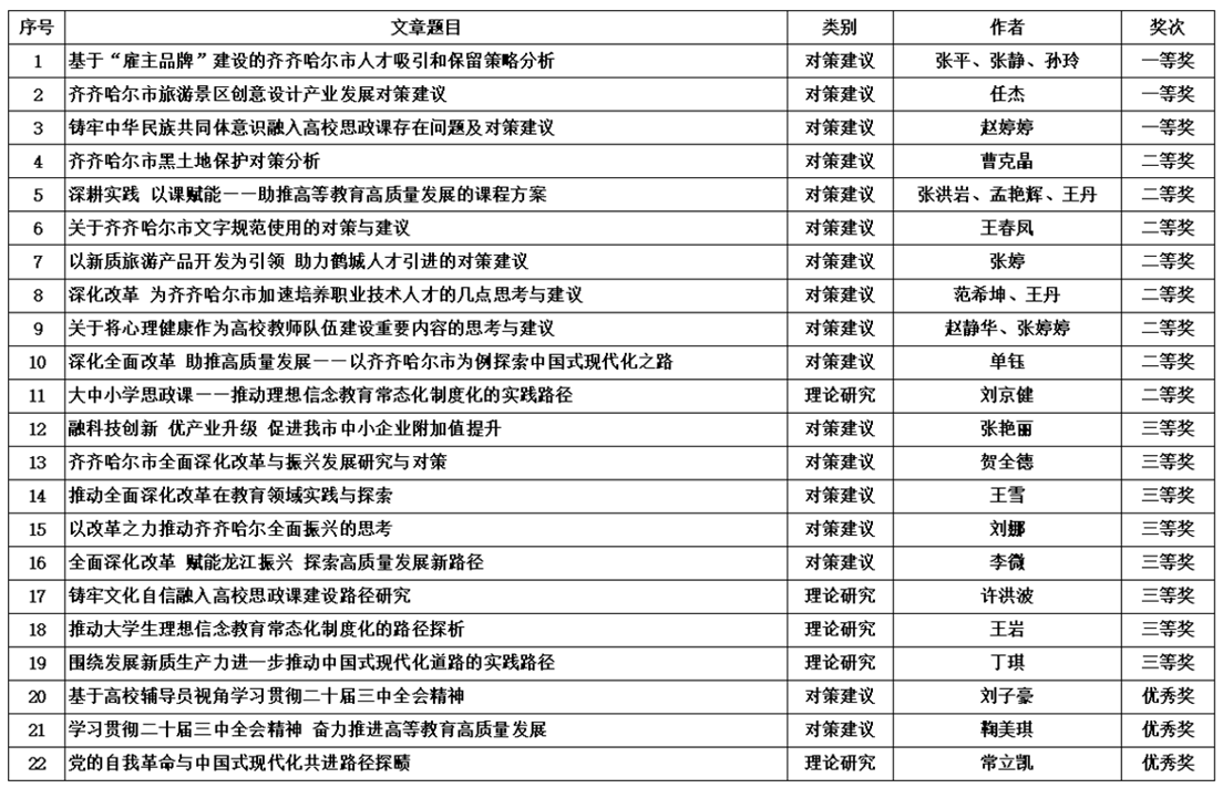 近日,市委宣传部、市社科联下发《关于学习宣传贯彻党的二十届三中全会精神主题征文评选结果的通知》(齐社联通〔2025〕1号),我校推荐申报的22篇征文作品均获奖,其中一等奖3篇,二等奖8篇,三等奖8篇,优秀奖3篇,超过全市获奖征文总数的1/6。