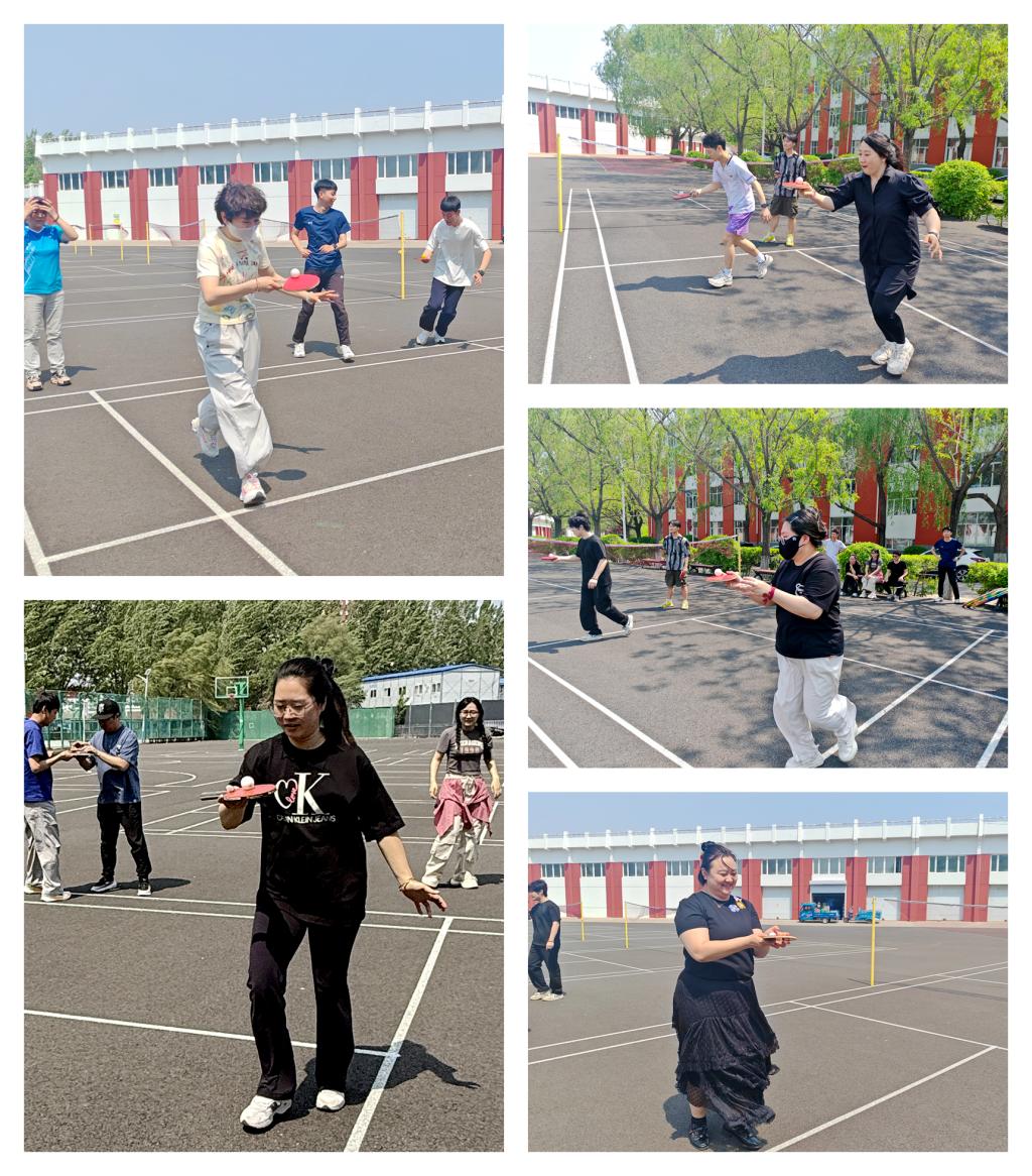 乒乓球托球接力项目同样精彩纷呈。老师们手持球拍,小心翼翼地托着乒乓球疾步飞奔。小小的乒乓球如同灵动的精灵,在球拍上欢快跳跃,选手们则屏气凝神,在保证球不掉落的前提下全力冲刺。有的老师身姿轻盈,步伐稳健,乒乓球稳稳地停留在球拍上;有的老师虽不小心让球滑落地面,但他们反应迅速,捡起后继续向着终点奋力奔跑。现场笑声与加油声交织,构成了一曲欢快的运动乐章。