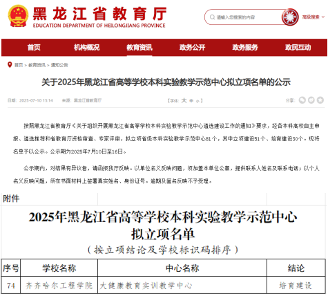 近日,黑龙江省教育厅公布了2025年黑龙江省高等学校本科实验教学示范中心拟立项名单。学校申报的“大健康教育实训教学中心”成功获批培育建设项目。这是我校首次获批省级实验教学示范中心培育项目,实现了零的突破。