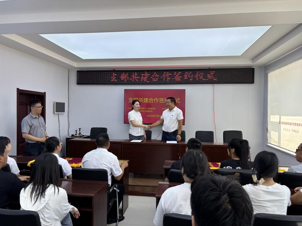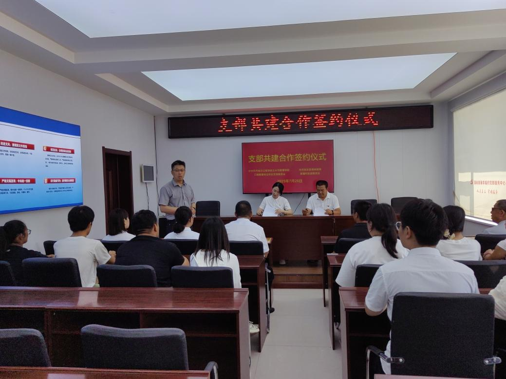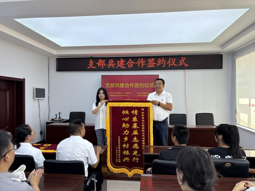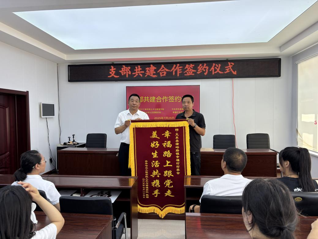 蔡爽代表党支部与贺全喜签订了《支部共建合作协议》,随后校地双方代表互赠了锦旗。