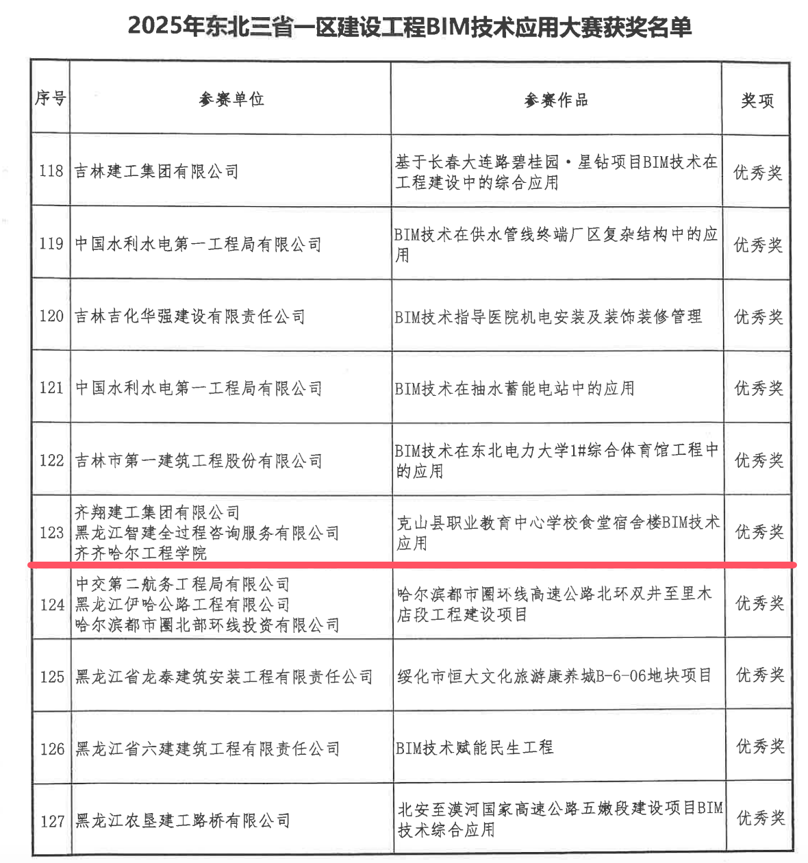 近日,东北三省一区2025年度建设工程BIM技术应用大赛结果揭晓,学校土木工程专业依托产业学院协同育人平台,联合合作企业打造的项目在众多成果中脱颖而出,斩获二等奖与优秀奖各一项,这一成绩充分展现了专业BIM技术教学实践的扎实功底,彰显了校企协同育人的显著成效。