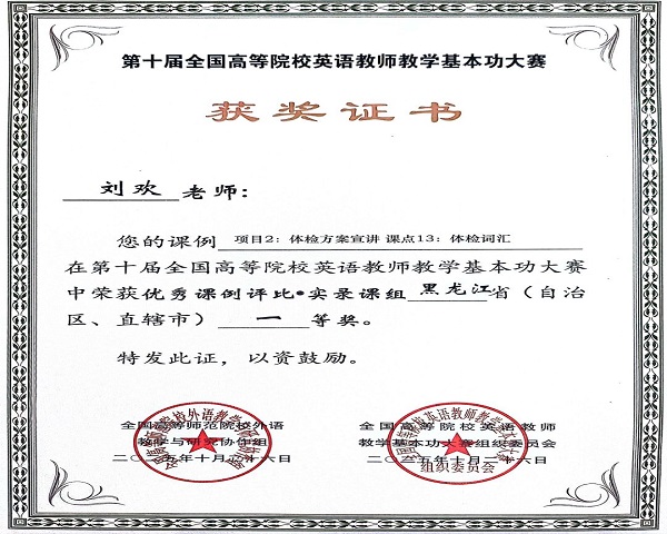 近日,第十届全国高等院校英语教师教学基本功大赛省赛结果正式公布,我校通识教育学院大学外语教研室参赛教师在省赛阶段喜获佳绩。参赛的10名教师全部获奖,获奖率达100%,较上一届有大幅提升。其中,孙德梅老师荣获优秀课例评比•说课组黑龙江省特等奖;孙伟、刘欢老师荣获实录课组黑龙江省一等奖;刘双丽老师荣获实录课组黑龙江省二等奖;乔亚男老师荣获说课组黑龙江省二等奖;齐锐、徐怡、鹿惠敏老师荣获说课组黑龙江省三等奖;李爽、史紫嫣老师荣获实录课组黑龙江省三等奖。