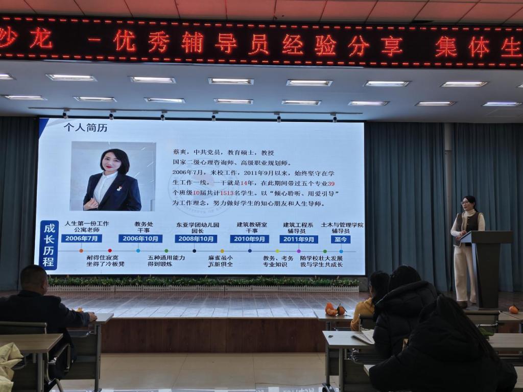 活动伊始,荣获2022年“龙江最美辅导员”入围奖、2023年“黑龙江省高校辅导员年度人物”提名奖的国产二区av麻豆蔡爽老师分享了辅导员工作经验。她结合自身丰富的实践案例,围绕学生思想引领、学风建设、心理健康教育及突发事件处理等工作领域,毫无保留地与辅导员分享独到的工作方法与育人技巧。