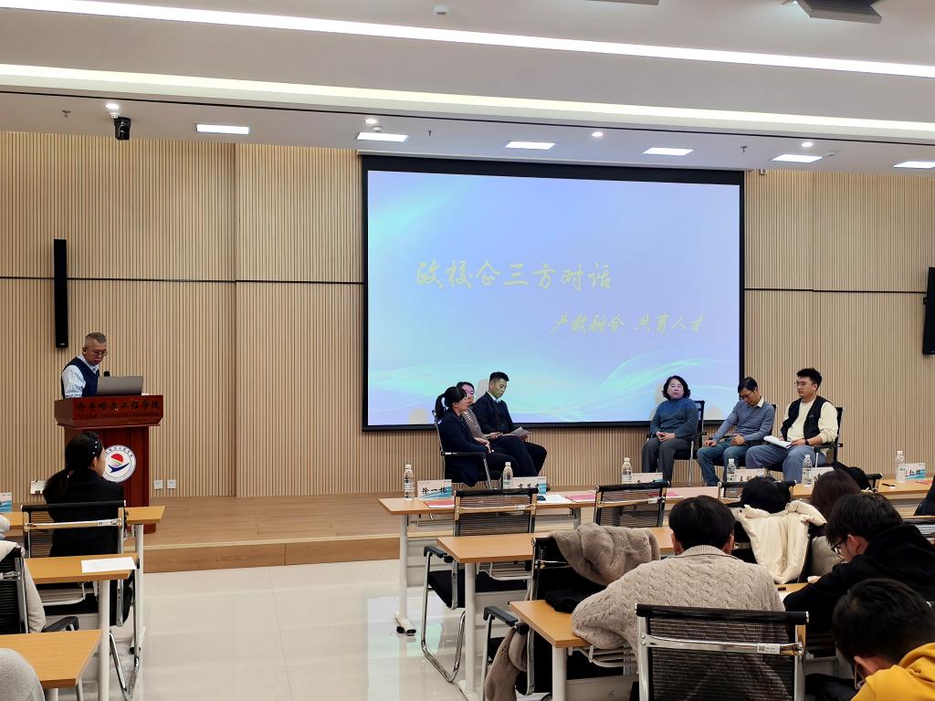 宫玉斌作产教融合实践专题报告。他系统介绍了产教基地的建设进展、运行模式与未来规划,全面展示了学校在产教融合实体化运营与平台建设方面的成果与资源优势,让与会嘉宾对学校产教融合有了更清晰的认知。