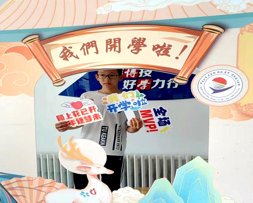 校门口大屏幕播放学校宣传片供家长和学生观看,校内播放着朝气蓬勃的歌曲,主楼内设有签到墙,校园内到处洋溢着欢乐的气氛。