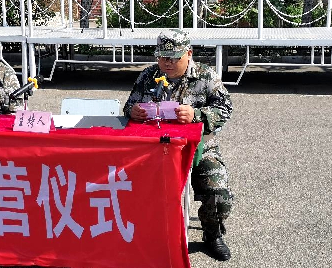 参训班主任逯恒良代表教师发言。他表示,军训期间,我们将和同学们一起迎接风雨,并肩作战!全体教师一定尽心尽力、尽职尽责,坚持教书育人、管理育人,为同学们搭建展示能力的平台,为同学们服务,让同学们满意,让家长放心。
