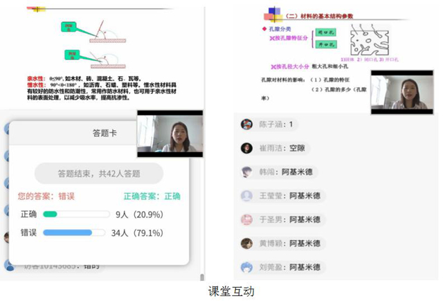 郝老师在直播课上讲解抗渗性时与火神山医院地基处理结合,告诉学生火神山医院在地基处理时,在地基上先铺了一层HDPE膜,这层膜的主要作用就是防止医院的废水废液渗透到周围的土壤和地下水中。火神山医院病房的框架构造,采用复合轻钢板材板房建造,这种活动板房可以迅速地组装与拆卸,并能保证良好的效果。板房的墙体采用了防火性能和保温性能好,还能隔热吸音的50毫米厚岩棉板。也正是有了这些复合材料,火神山医院才得以在10天内建成。让学生从中切实感受到自己的课程与现实如此接近,增强了学生的专业认同感。同时,还引申讲述火神山医院背后的中国力量,培养学生的家国情怀。勉励学生把专业知识学好,将来回报国家和社会。《土木工程材料》将思政元素融入每节课堂,思政教育贯穿教学设计和实施全程。