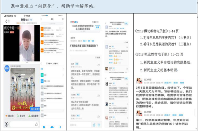 经《概论》课程教研组教研后确定,本课为学生选用首都师范大学李松林老师《毛泽东思想和中国特色社会主义理论体系概论》课程的优质慕课资源。同时,赵婷婷老师为学生开展每周1学时的线上直播教学,在宝贵的45分钟内,为学生提炼重点、解答难点、明确要点,即以问题为导向,围绕问题将重点、难点、要点贯穿,授课思路清晰,学生听得明白。例如:专题一,设置问题“毛泽东作为中国无产阶级革命的第一代领袖,他的卓越贡献有哪些”,在回答这一问题的过程中,就把毛泽东思想的形成和发展、毛泽东思想的主要内容和活的灵魂以及历史地位等知识点串联起来。在以“学生学习为中心”的模式下,构建问题导向讲授新知,能够激发学生探究和解决问题的能力,实现由“低阶学习”向“高阶学习”过渡。赵炬明教授在《关于实施“以学生为中心”的本科教学改革的思考》中,曾批评“大学就是这样一种地方,老师的笔记直接转化为学生的笔记,只是谁也不动脑子”。因此,在教学互动过程中,赵婷婷老师要求学生以回答问题的形式参与,在“定义问题、解决问题”的过程中使学生思维得到训练,大脑得到思考。
